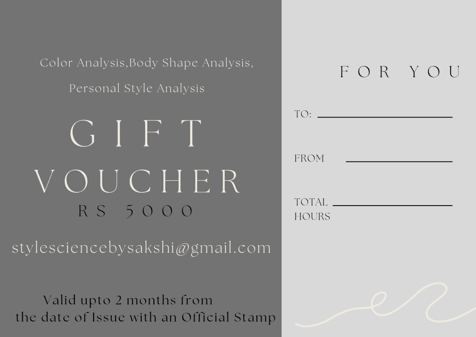 Please email stylesciencebysakshi@gmail.com with the name of the person gifting and the name of the recipient. Once we receive these details, we will share the payment link. After payment confirmation, your personalized gift voucher will be issued with all required details and an official stamp.